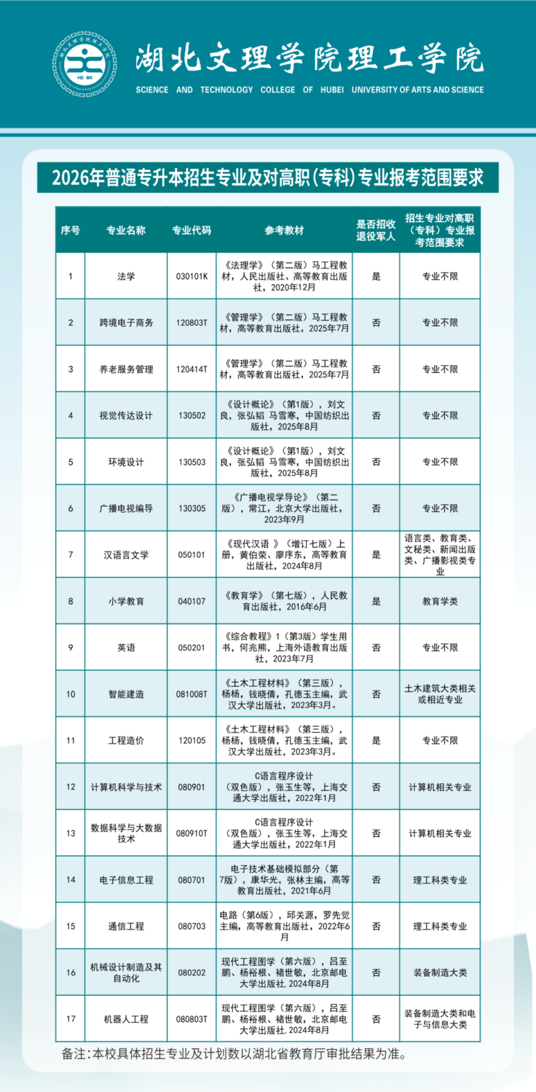 湖北文理学院理工学院2026年普通专升本招生简章