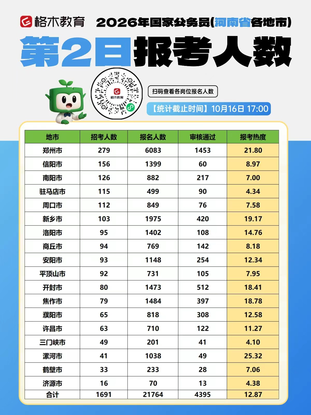 2026年国考首日报名人数统计:截至10月16日17时,河南招录1691人,报名人数21764人,审核通过4395人。