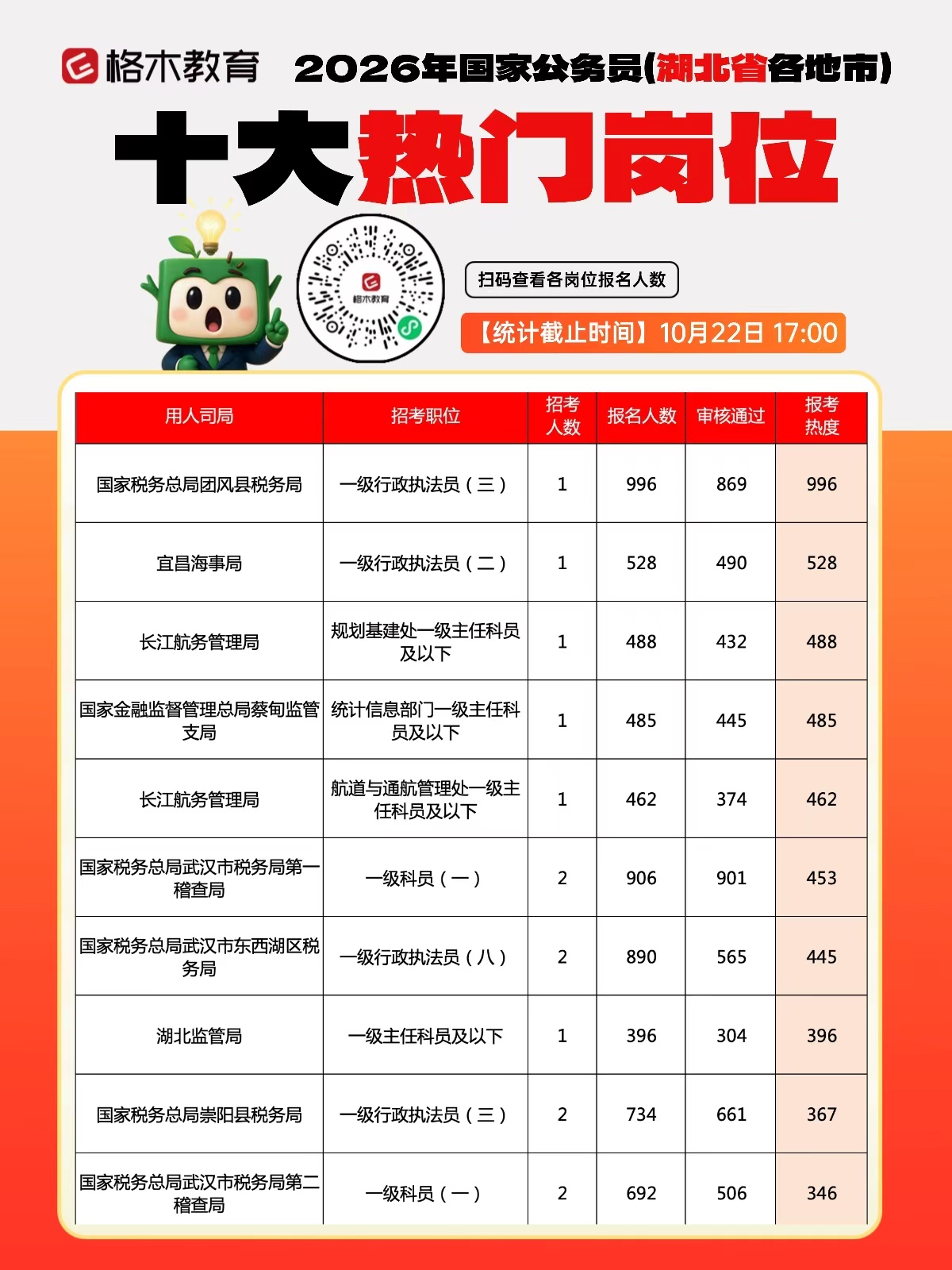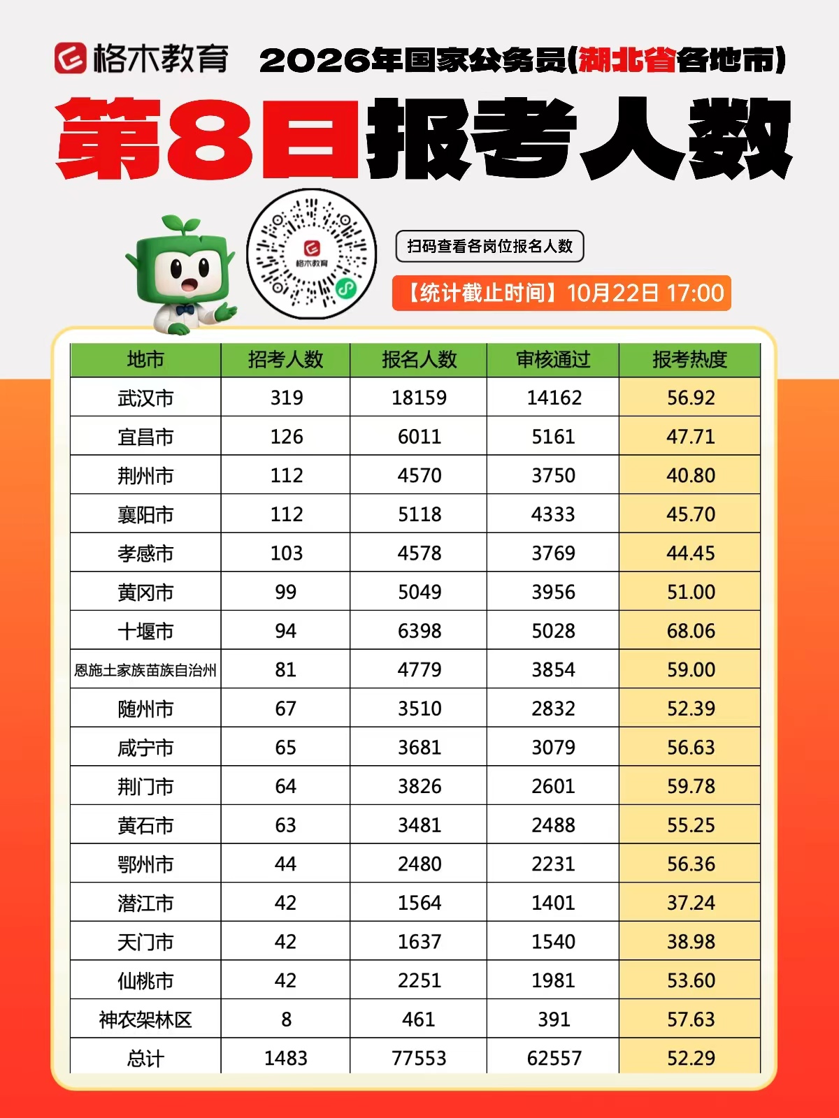 2026年国考报名人数统计:截至10月22日17:00时,湖北招录1483人,报名人数77553人,审核通过62557人。