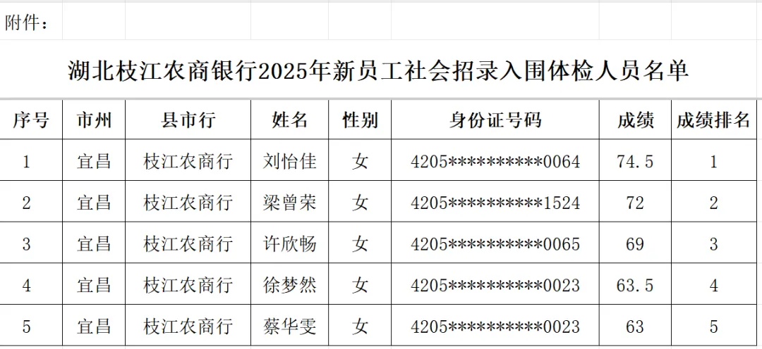 根据“全省农商行2025年新员工社会招录公告”的有关规定,按照划定入围分数线的规则(根据笔试成绩排名,按招录计划1:1比例,确定参加体检人员),已划定入围分数线,确定了入围体检环节人员名单,现将结果公告如下: