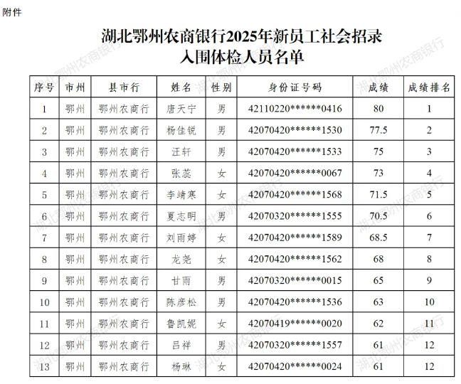 2025年鄂州农商银行新员工社会招录入围分数线公告