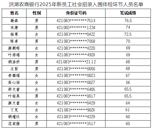 2025年洪湖农商银行新员工社会招录入围分数线公告