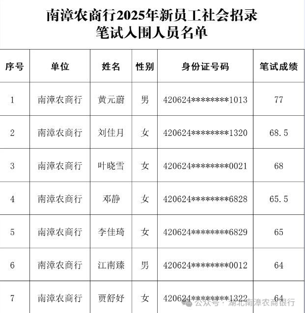 根据“全省农商行2025年新员工社会招录公告”的有关规定,按照划定入围分数线的规则(根据笔试成绩排名,按招录计划1:1比例,确定参加体检人员),已划定入围分数线,确定了入围体检环节人员名单,现将结果公告如下: