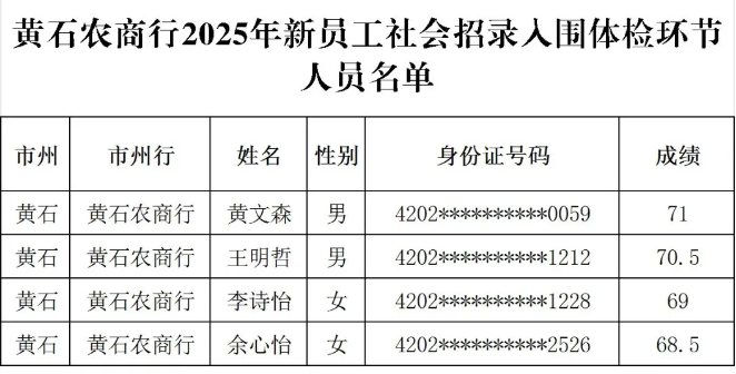 根据“全省农商行2025年新员工社会招录公告”的有关规定,按照划定入围分数线的规则(根据笔试成绩排名,按招录计划1:1比例,确定参加体检人员),已划定入围分数线,确定了入围体检环节人员名单,现将结果公告如下: