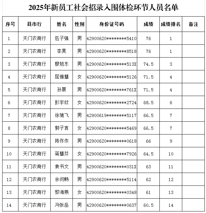 根据“全省农商行2025年新员工社会招录公告”的有关规定,按照划定入围分数线的规则(根据笔试成绩排名,按招录计划1:1比例,确定参加体检人员),已划定入围分数线,确定了入围体检环节人员名单,现将结果公告如下:
