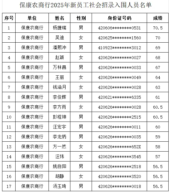 根据“全省农商行2025年新员工社会招录公告”的有关规定,按照划定入围分数线的规则(根据笔试成绩排名,按招录计划1:1比例,确定参加体检人员),已划定入围分数线,确定了入围体检环节人员名单,现将结果公告如下: