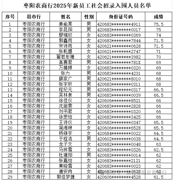 枣阳农商行2025年新员工社会招录入围分数线公告
