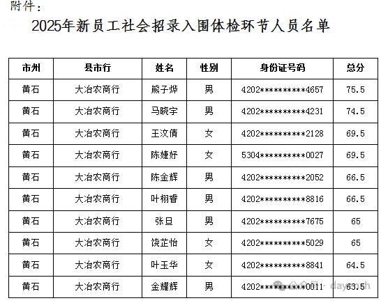 根据“全省农商行2025年新员工社会招录公告”的有关规定,按照划定入围分数线的规则(根据笔试成绩排名,按招录计划1:1比例,确定参加体检人员),已划定入围分数线,确定了大冶农商行入围体检环节的人员名单(具体见以下附件),现将结果公告如下:
