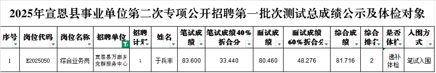 根据《2025年恩施州事业单位第二次专项公开招聘工作人员公告》和《2025年宣恩县事业单位第二次专项公开招聘第一批次测试总成绩公示及体检工作安排》,因部分考生主动放弃,须依规递补,现就递补体检对象的情况及有关事项公告如下: