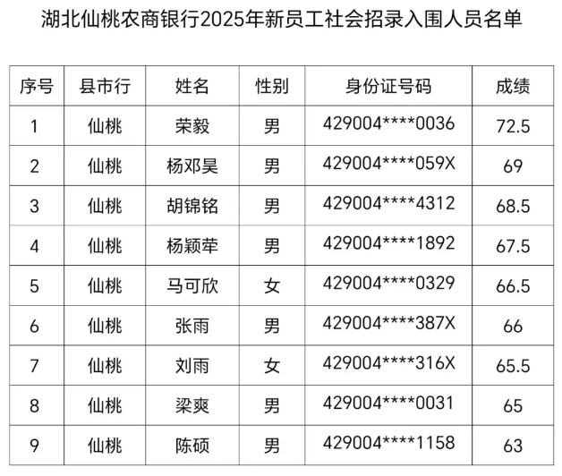 根据“全省农商行2025年新员工社会招录公告”的有关规定,按照划定入围分数线的规则(根据笔试成绩排名,按招录计划1:1比例,确定参加体检人员),已划定入围分数线,确定了入围体检环节人员名单,现将结果公告如下: