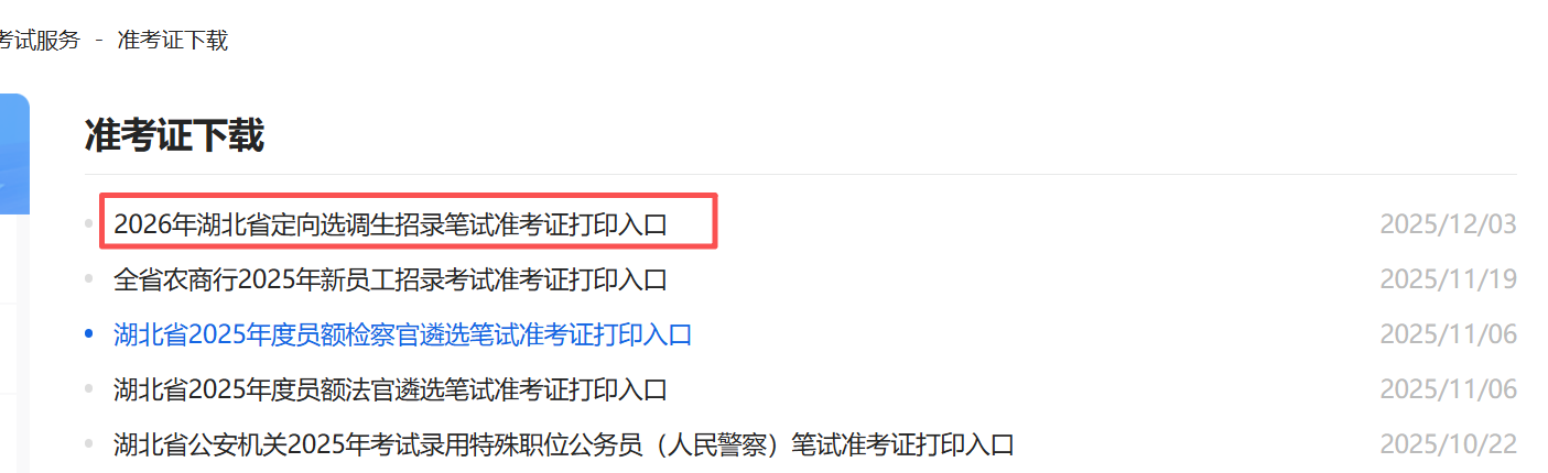 准考证打印时间为2025年12月3日10:00至12月7日8:00,请及时登录湖北省人事考试网下载打印笔试准考证,并认真阅读准考证所示应试须知。
