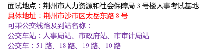 面试地点:荆州市人力资源和社会保障局3号楼人事考试基地。具体地址:荆州市沙市区太岳东路8号,详见《荆州市人力资源和社会保障局3号楼人事考试基地位置地图》(附件1)。