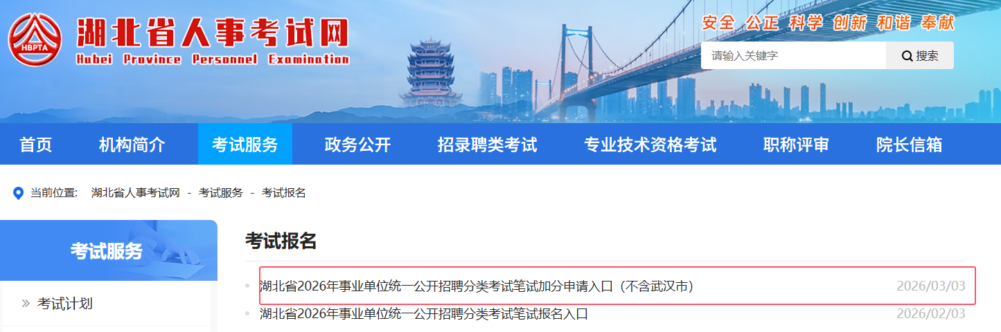 湖北省2026年事业单位统一公开招聘分类考试笔试加分申请入口(不含武汉市)