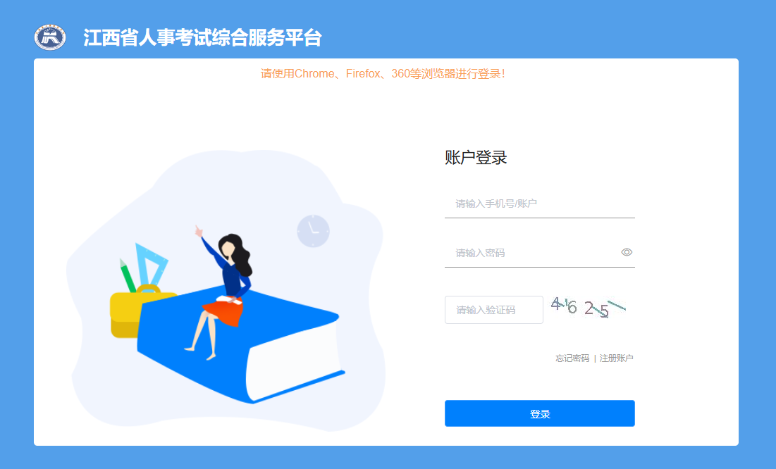 1.登录“江西省人事考试综合服务平台”(https://pta.jxhrss.gov.cn/#/login)。