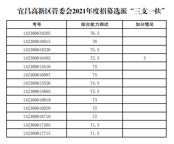 经过笔试及资格复审,根据招募岗位计划数与资格复审合格人数1:3的比例,按照笔试成绩从高分到低分确定进入面试的13名考生,详见《2021年宜昌高新区招募选派“三支一扶”高校毕业生面试人员名单》(详见附件)。