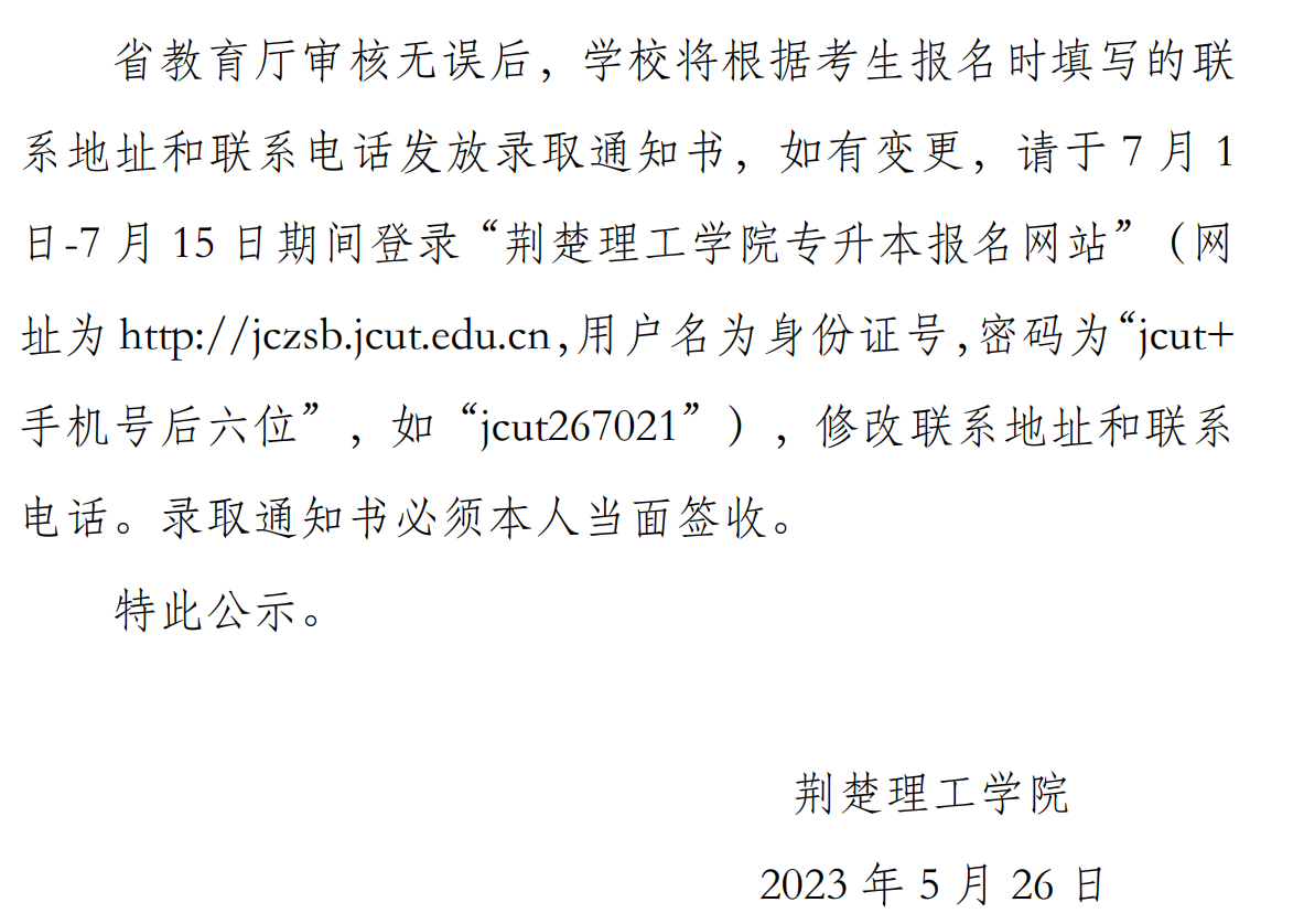 荆楚理工学院也在预录取名单下方做了邮寄地址修改时间的说明