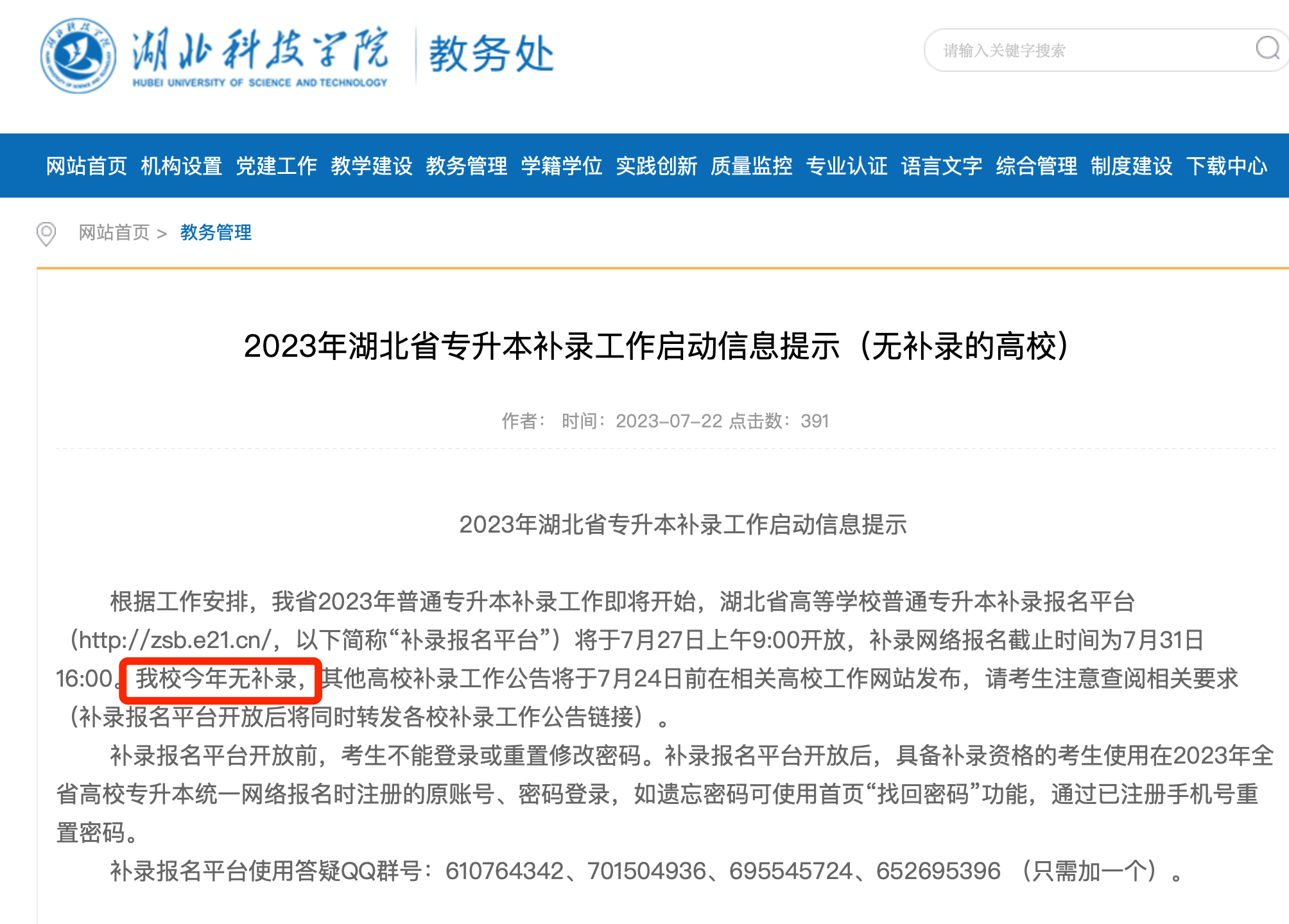 2023年湖北省专升本补录工作启动信息提示(湖北科技学院)