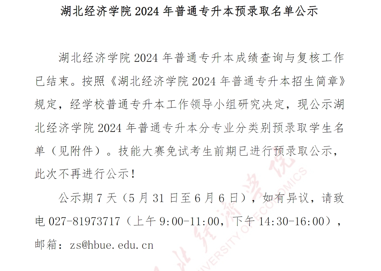 湖北经济学院 2024 年普通专升本预录取名单公示