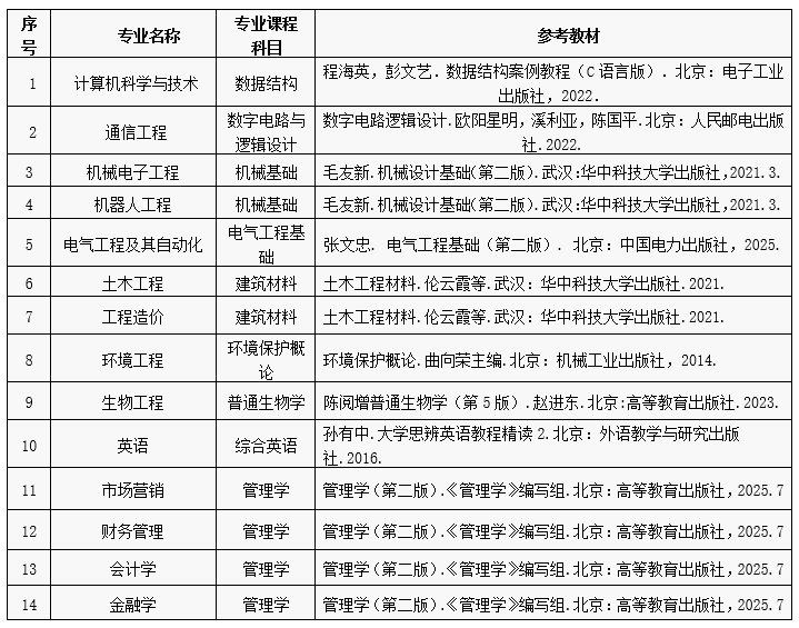 普通类考生专业课程考试科目及参考教材见下表: