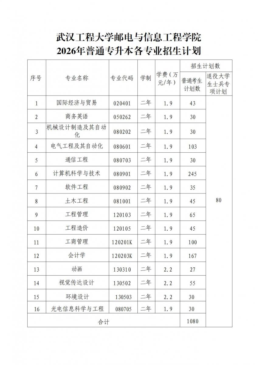 武汉工程大学邮电与信息工程学院2026年普通专升本各专业招生计划