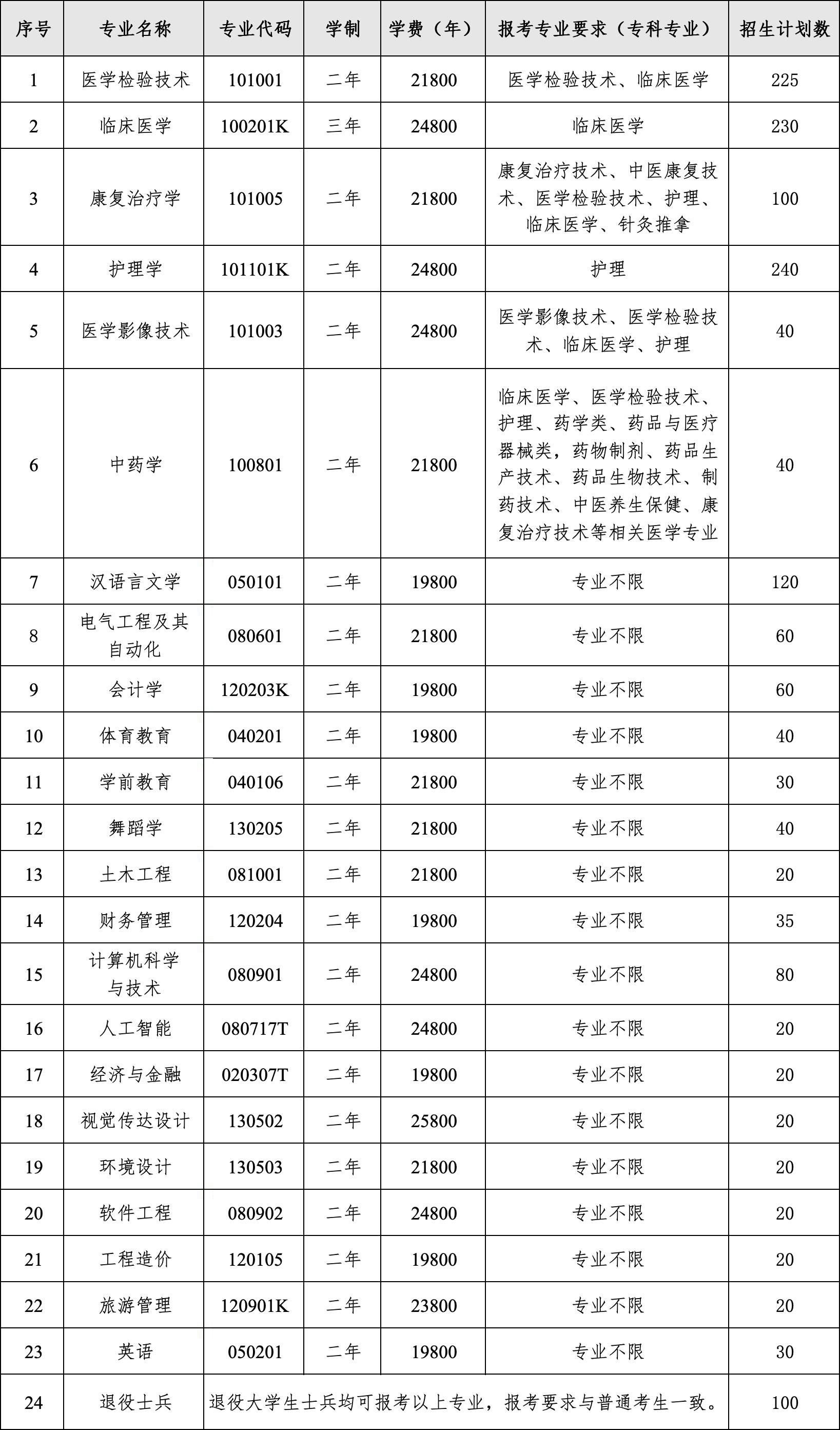 专升本学生(含退役大学生士兵)为我校普通全日制学生,除临床医学为3年制外,其余均为2年制。不得采取非全日制学习形式就读,入学后不得转专业和转学。