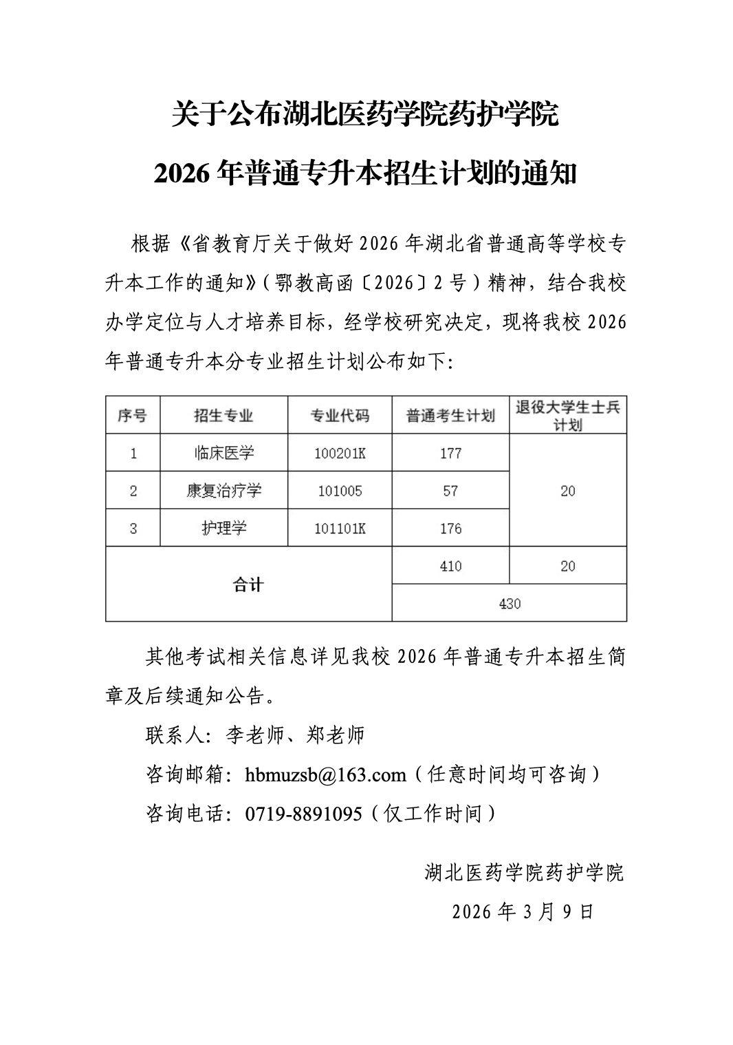 湖北医药学院药护学院2026普通专升本招生计划