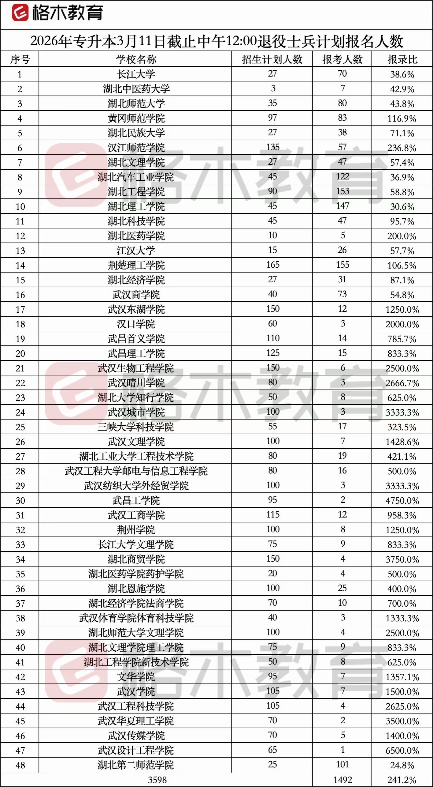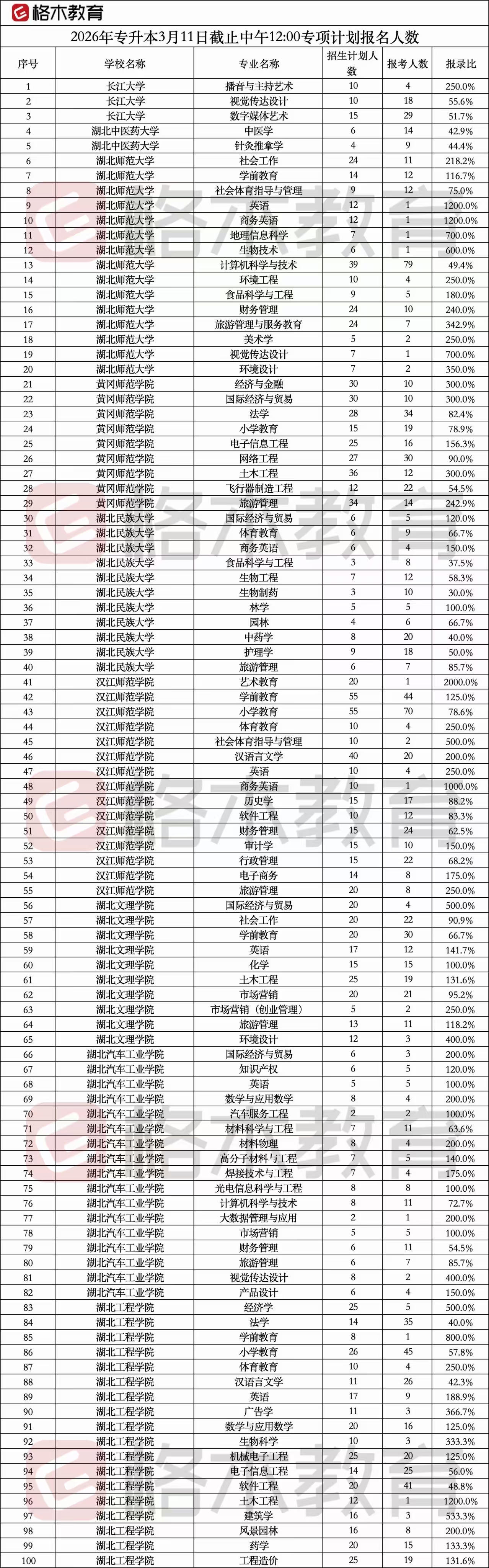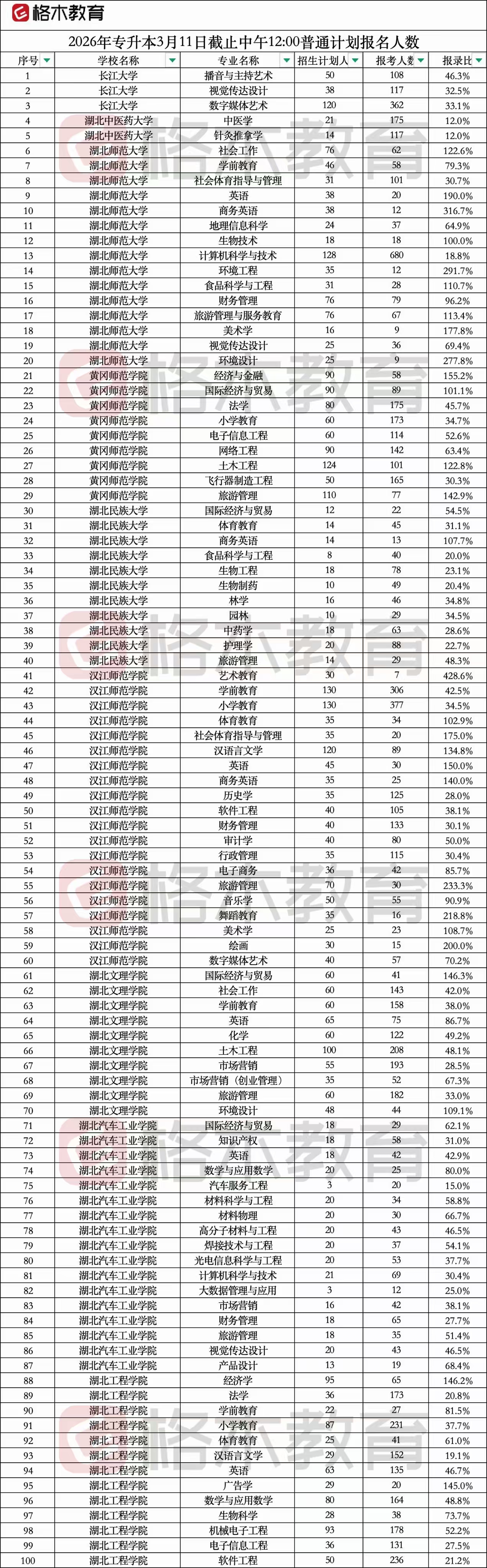 2026年湖北普通专升本报名人数统计(3月11日12:00)