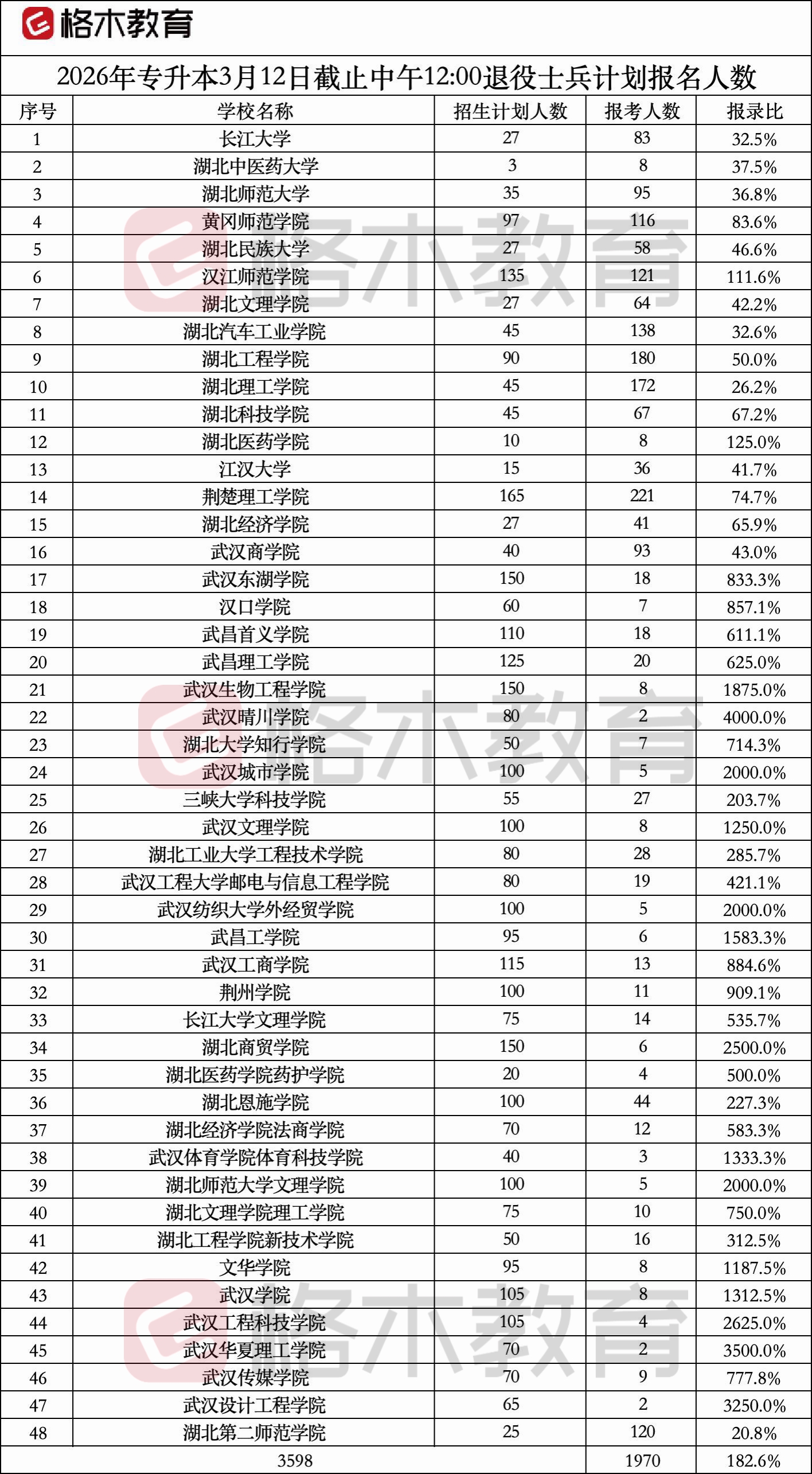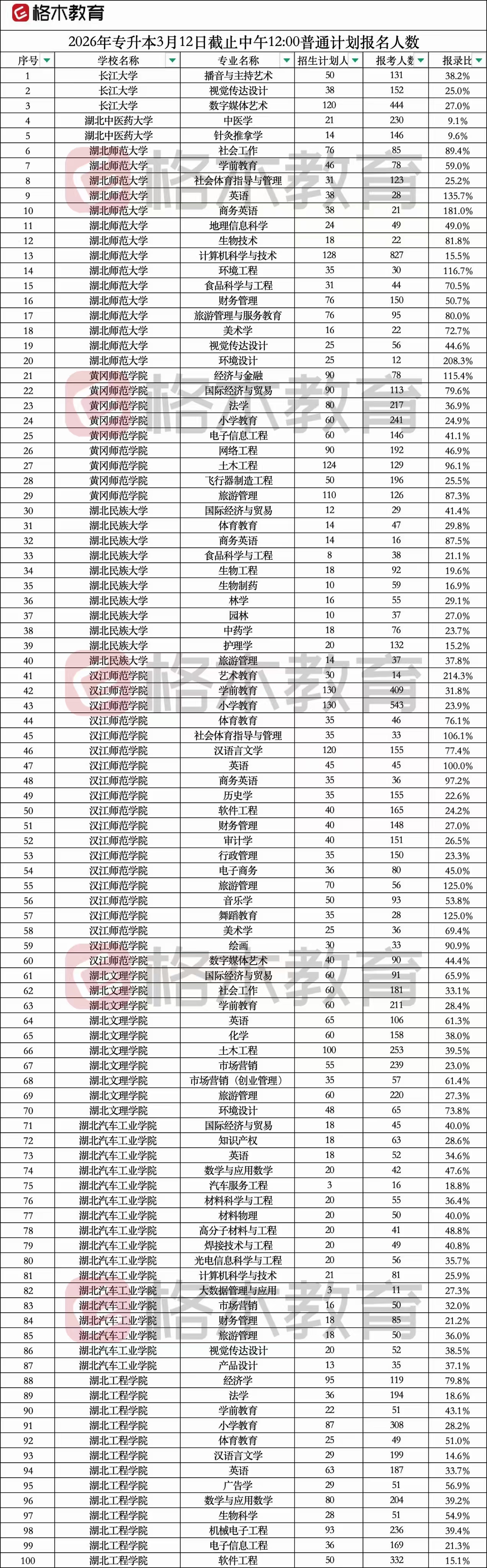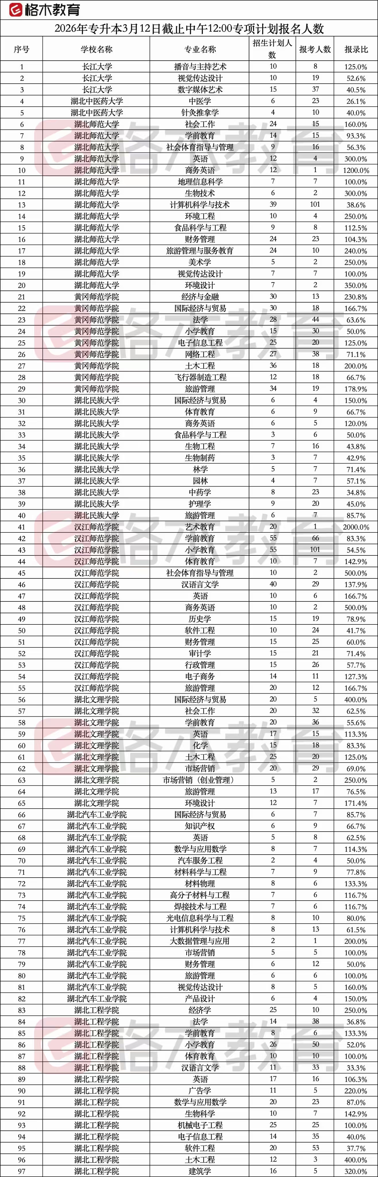 2026年湖北普通专升本报名人数统计(3月12日12:00)